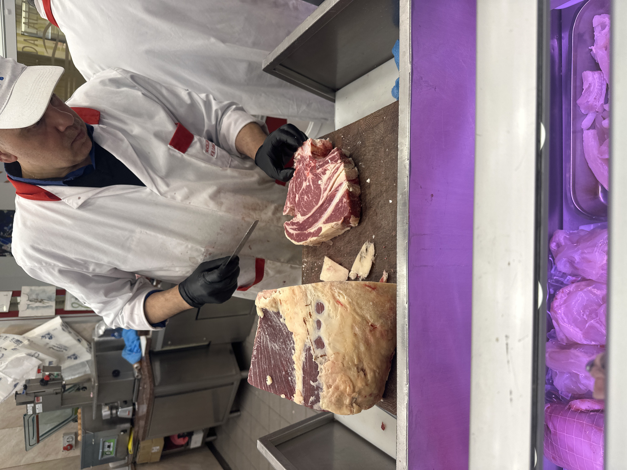 This image depicts the interior of a commercial butcher shop in Milan, Italy. A male butcher, wearing a white lab coat with red trim, a white baseball cap, and black gloves, is observed in the act of cutting raw red meat on a dark brown wooden cutting board. He holds a metal knife in his right hand. To the left, a large, irregularly shaped slab of beef, exhibiting both lean muscle and a thick layer of fat, stands upright. To the right of the large slab, a thick, pre-cut portion of bone-in meat, likely a ribeye steak, rests horizontally on the board. Small pieces of fat trimmings are scattered around the work area. The butcher's focus is directed downwards towards the meat. The back of another individual, also dressed in a white coat, is partially visible on the far right. In the background, stainless steel professional kitchen equipment, including a bandsaw or slicer and other machinery, is situated on a counter. White plastic bags with blue patterns hang from a rail on the wall. The immediate foreground reveals the upper section of a refrigerated display case, illuminated with a purple light, showcasing various packaged raw meat products, including a netted roast and other cuts in transparent plastic, on a lower shelf. The environment features tiled walls and flooring.