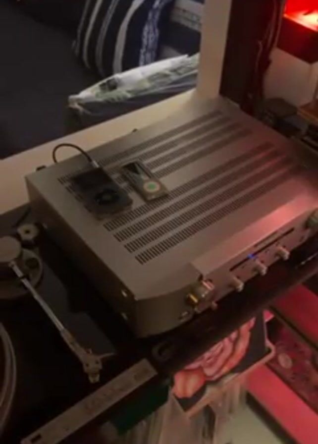 A turntable, amplifier, and two iPods sit on a black shelf. The amplifier is silver with small blue lights lit up on the right side of its face. Both iPods are plugged into the amplifier. Beneath the shelf are stacks of books, photos, and some miscellaneous decorations. A striped pillow and part of a couch can be seen out of a window behind the amplifier. The walls are a beige color. The scene is lit with natural light and a red light off to the right of the frame.