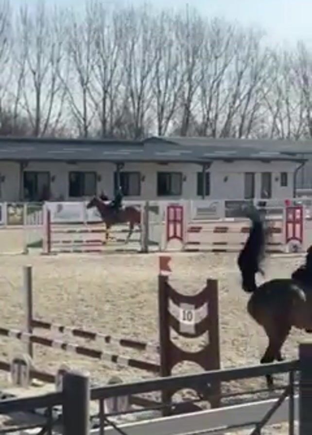 A person is riding a brown horse over a jump in an outdoor arena. The rider is wearing dark clothing and a helmet. The horse clears the jump, which has the number 10 on it. A second horse and rider are visible in the background, along with a person standing near some other jumps. The arena is surrounded by a white fence, and there are trees and a building in the background. The sky is bright.