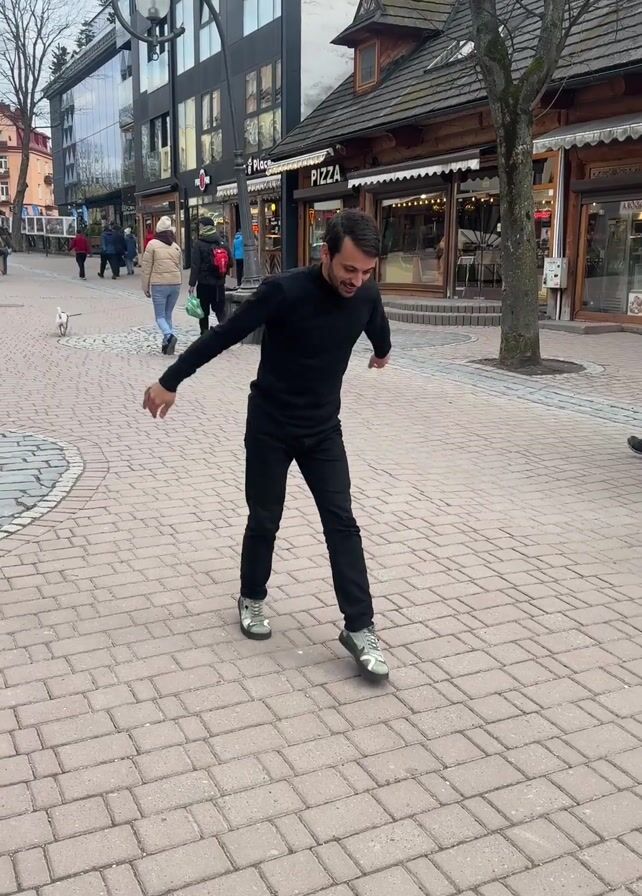 A man in a black turtleneck, black pants, and gray shoes stands on a brick-paved street. He gives a thumbs-up to the camera, bends over, and then does a backflip. A person off-camera cheers. The street is lined with buildings, including a pizza shop. Other people can be seen walking in the background. The sky is overcast.