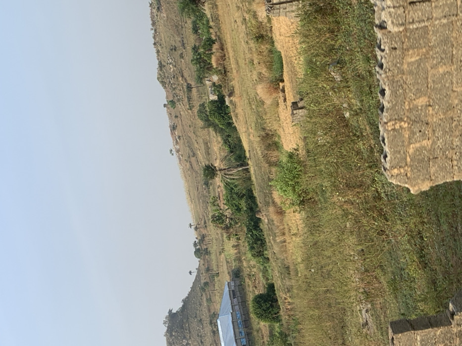 A landscape features a rocky hillside with sparse vegetation and a few trees dotting the terrain. In the foreground, dry, golden-hued grasses blend with low-lying shrubs. A structure with a blue roof nestles into the base of the hill. A weathered, stone wall occupies the extreme right side of the view. A clear, light blue sky provides the backdrop.