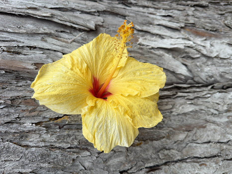 - "A vertical, close-up photograph captures a single yellow hibiscus flower positioned against the textured, greyish-brown bark of a tree" by FM-oB3Mx2, licensed under CC BY 4.0