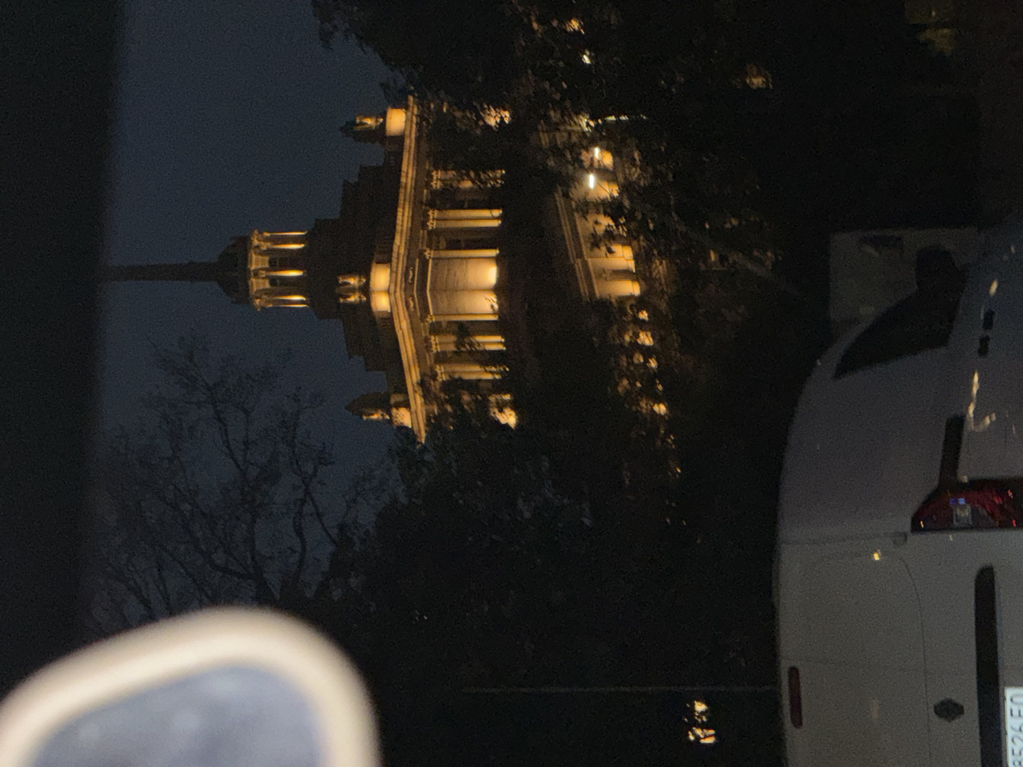 A nighttime shot features a towering, illuminated building with a spire, partially obscured by trees. Its architecture is elaborate, with multiple levels and intricate detailing. A white van is partially visible on the right, its taillight and license plate vaguely discernible. A blurred object occupies the lower left corner, adding an element of abstraction to the scene. The overall atmosphere is dark, with the building's lights creating a striking contrast against the night sky.
