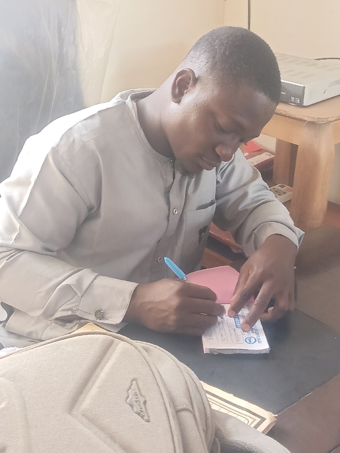 An adult male is seated at a dark-colored desk, engaged in writing in a setting within Akwanga, Nigeria