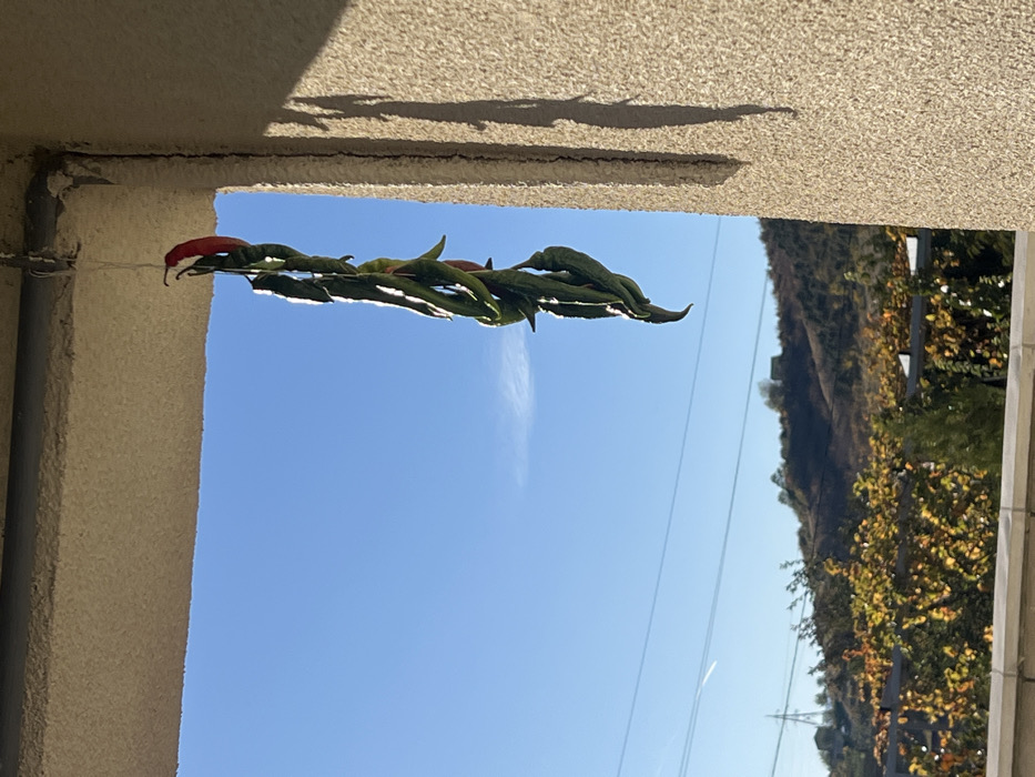 - "An outdoor scene in Tbilisi, Georgia, features a vertical string of approximately 15-20 elongated chili peppers, predominantly green with a single red pepper at the top, suspended from a small metal hook" by FM-QWs9h1, licensed under CC BY 4.0