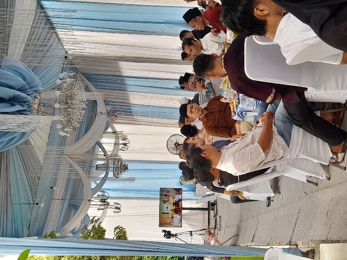 gathering of men under a white and blue canopy tent in Kecamatan Buduran, Indonesia. There are numerous white folding chairs arranged in rows. The men are dressed in formal attire and some are wearing traditional Indonesian clothing. There is a large screen playing a video and a chandelier hanging from the canopy. The environment is well-lit and the chairs are arranged neatly. The attendees appear to be engaged in conversation and some are sitting while others are standing. The camera is capturing the scene from a wide-angle, providing a comprehensive view of the attendees and their interactions.