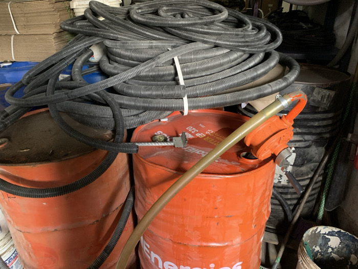 This image, taken in Babawa, Nigeria, depicts an indoor storage or workshop environment. In the foreground and midground are two prominent orange metal drums. The drum on the right features a visible label indicating "Energizer EP 320" and has an orange, hand-operated pump with a brass-toned pipe inserted into its top opening. A large quantity of black, corrugated flexible conduit, some coiled and some loosely arranged, rests atop both orange drums and extends upwards into the background. Several coils of this conduit are secured with white ties. A section of this black conduit runs from the left side, over the left orange drum, and connects to a metallic fitting on the right orange drum. Partially visible behind the conduits on the left is a dark blue plastic barrel. Another dark metal drum is partially discernible behind the right orange drum. In the upper left background, stacked cardboard boxes tied with white string are visible, alongside other miscellaneous items, suggesting a cluttered storage area. No individuals are present.