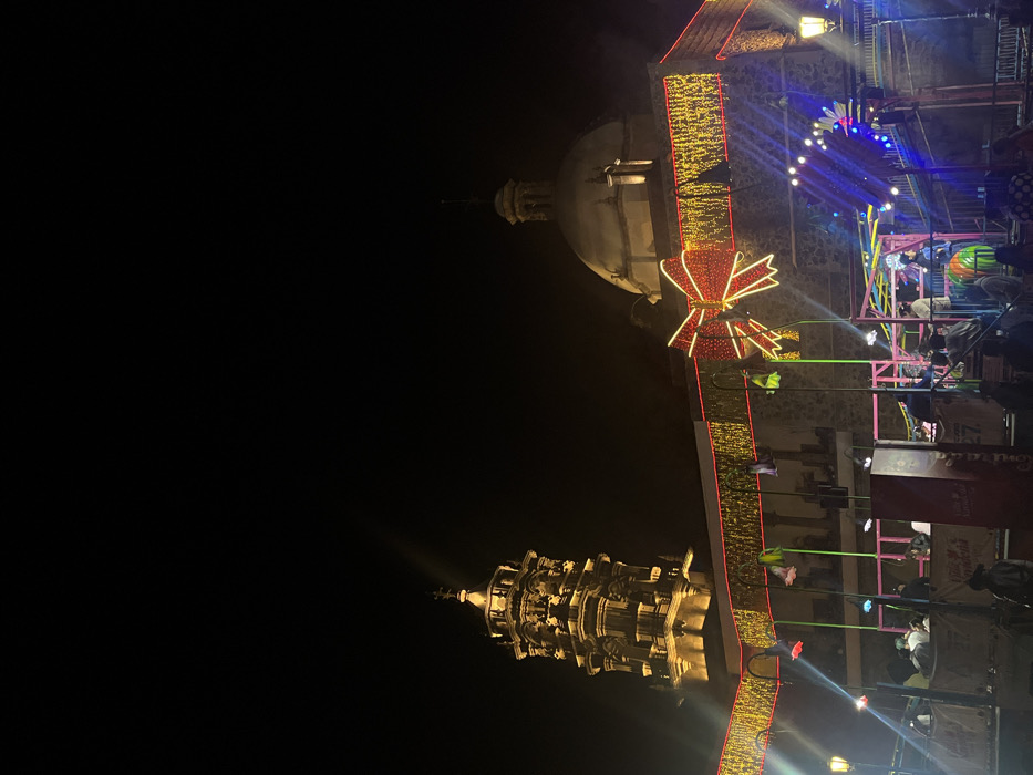 A dark, nighttime scene shows a church dome illuminated on the upper right. Below and to the left is a decorative tower also lit up. The church structure is adorned with Christmas-themed decorations, including golden ribbon-like lights and a large red bow. Part of a fair or carnival ride is visible in the background along with a crowd of people. The photograph seems to be taken during a celebration or event.