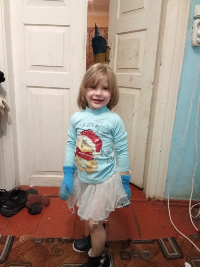 A small child with blond hair smiles at the camera. She wears a light blue, long-sleeved shirt with a cartoon bear on the front, a white tutu, blue gloves, and black boots. She stands in front of a white door with a glimpse into another room showing a blue and yellow item hanging from the ceiling. Various shoes are on the floor to her left. The walls are painted with light blues and whites. The floor has a reddish tone with a dark, patterned rug in the foreground.