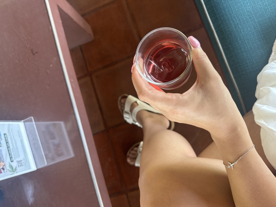 A woman's perspective captures a glass of red liquid held in her manicured hand. Below, her tanned legs are crossed, adorned with an airplane charm bracelet. She wears white sandals on her feet. The scene is set indoors, likely a hotel room, with a dark brown tiled floor and a partially visible turquoise couch. A table with a menu stand completes the casual and relaxed setting.