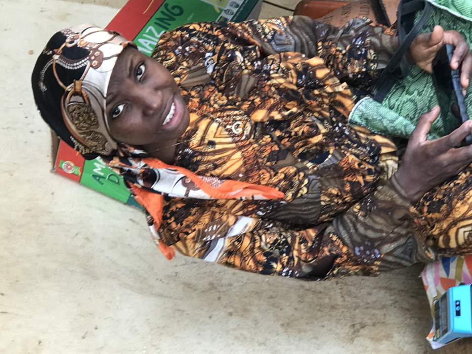 An upward-angled, medium close-up photograph depicts a woman seated in an interior or semi-enclosed setting within the city of Ijoko, Nigeria. The woman, with dark skin, wears a long-sleeved garment featuring an intricate pattern in shades of brown, black, and orange. Her head is covered by a multi-patterned headscarf primarily black, white, and orange, secured at the front. A thin gold-colored necklace with a circular pendant is visible around her neck. She gazes directly at the camera, her mouth slightly open, revealing teeth. Her hands are positioned in front of her, holding a black smartphone. A green, textured fabric is draped over her lap or nearby. To her immediate left, on a patterned surface, a light blue electronic device, possibly a point-of-sale (POS) terminal, is visible. The background consists of a plain, light-colored wall with some texture. Leaning against this wall to the right are sections of cardboard packaging or posters displaying green and red panels with partial text, including "AMAZING." The scene is illuminated by ambient light.