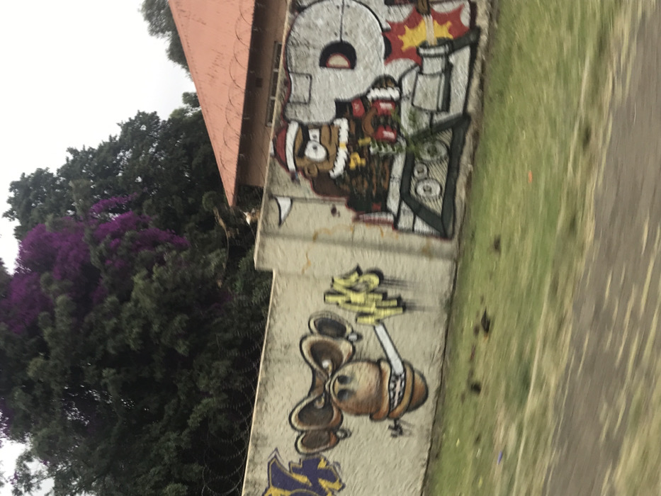 This image depicts a concrete perimeter wall in a suburban area of Johannesburg, South Africa, captured from a moving vehicle