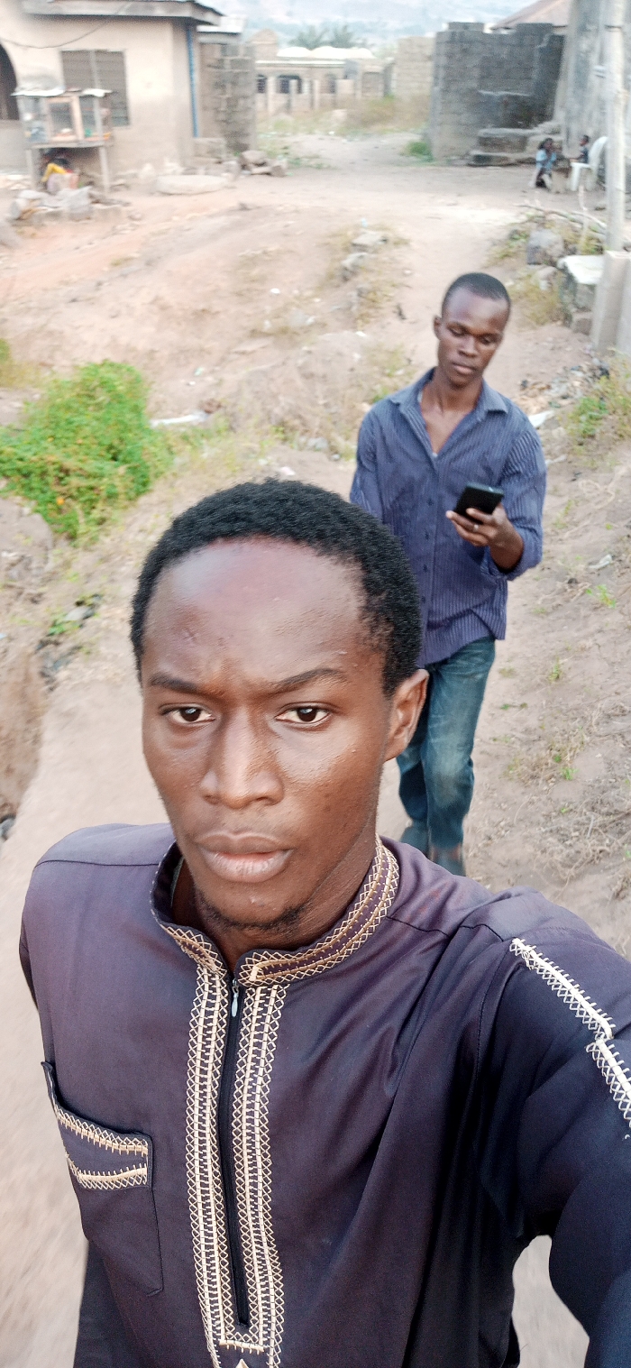Two men are outdoors, one in the foreground and the other slightly behind him. The man in front wears a dark-colored, patterned shirt with a zipper. The man in the background is in a blue button-down shirt and jeans, looking at a smartphone. The setting appears to be a dirt road or path in a semi-rural or developing area, with buildings and vegetation in the background. The overall lighting suggests it's daytime.