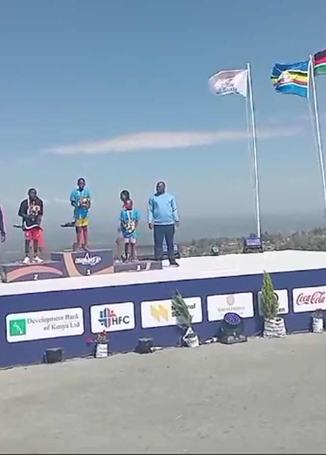 A medium shot shows a podium on a sunny day. The podium is blue and white and has sponsor logos on the front. Two young runners stand on the podium, one on the top step and one on the second step. Each is wearing a medal. Four adults stand on or next to the podium. Flags of an organization, Uganda, and Kenya are visible behind the podium. A monitor shows a picture of the race. One person in a blue jacket walks in front of the camera.