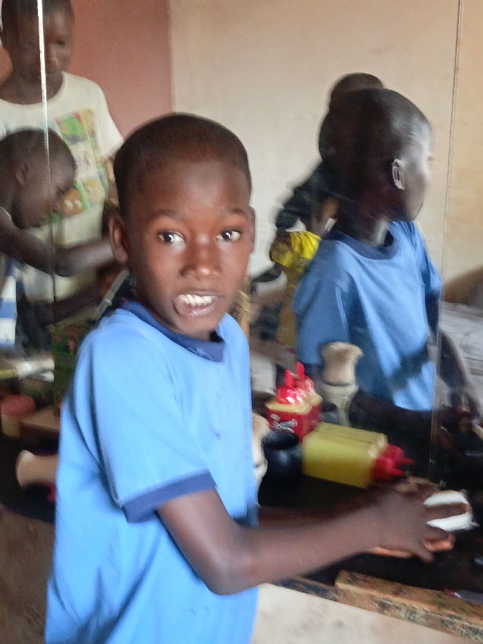 The image depicts an indoor scene in Akwanga, Nigeria, featuring multiple individuals and a counter with various objects. In the foreground, a young male juvenile with dark skin and short dark hair, wearing a light blue short-sleeved shirt, faces the observer directly with his mouth slightly open. His right arm is extended forward, and his hand holds a white object, appearing to wipe a dark wooden surface, possibly a counter. Reflected in a large mirror occupying the right background, the primary juvenile is seen facing away to the right. Also reflected in the mirror is another juvenile, wearing a blue shirt, looking down towards the counter. Additional individuals, including an adult female in a white t-shirt and another juvenile in a striped shirt, are partially visible in the left background, with their reflections also present in the mirror. On the wooden counter, from left to right, are a dark pot, a red and white squeeze bottle with red spouts, a light-colored wooden object (possibly a brush or tool handle), and a yellow squeeze bottle with red spouts. The walls in the background are light-colored.