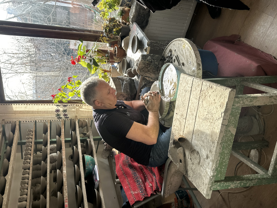 An adult male, with short grey hair, is seated and actively throwing pottery on a potter's wheel inside a workshop in Horezu, Romania