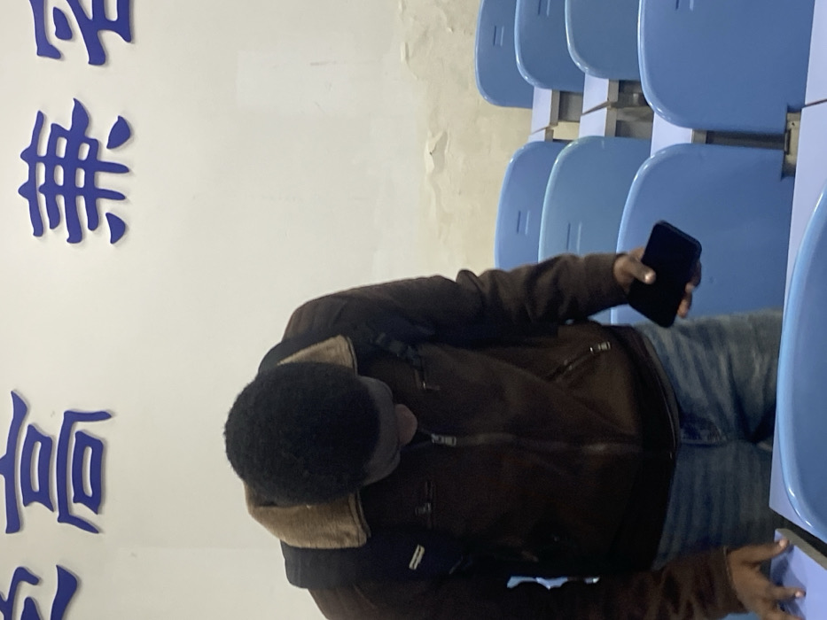 A man sits in a row of blue stadium-style seats, engrossed in his smartphone. He wears a brown jacket with a tan collar and blue jeans. The phone is held in his right hand. Behind him, a wall with large, dark blue characters vertically arranged, possibly Chinese or Japanese. The wall is white with some discoloration. The image is slightly tilted, with the row of seats appearing diagonal.