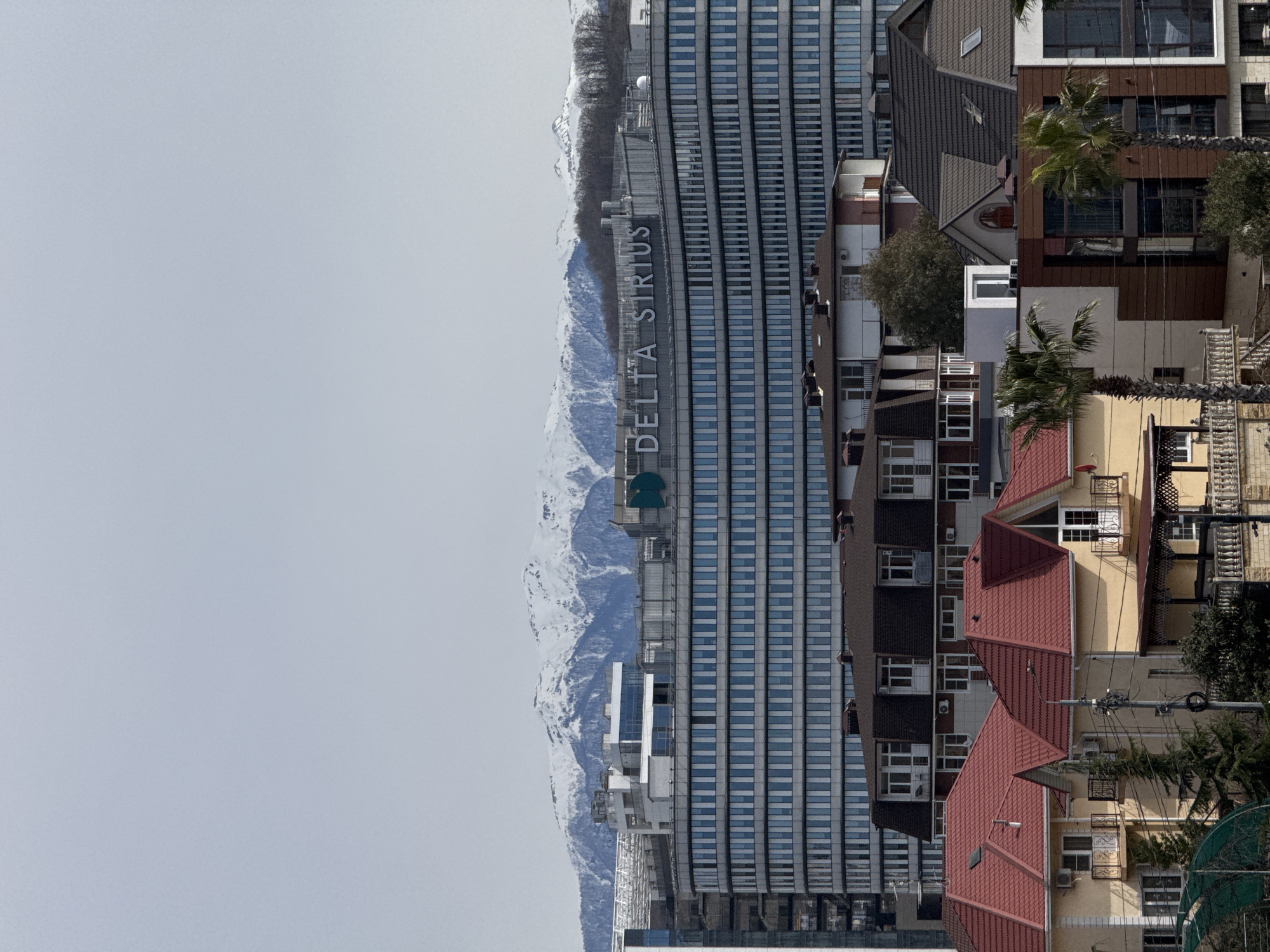 cityscape in Sirius, Russia. In the background are snow-covered mountains and an overcast sky. Adjacent to the mountains is a tall, modern building with the words "DELTA SIRIUS" vertically displayed on its facade. To the right of this building are several smaller buildings and houses with a mix of architectural styles, including red-tiled roofs and beige walls. Palm trees are visible among the buildings. Overhead power lines are strung between the buildings.