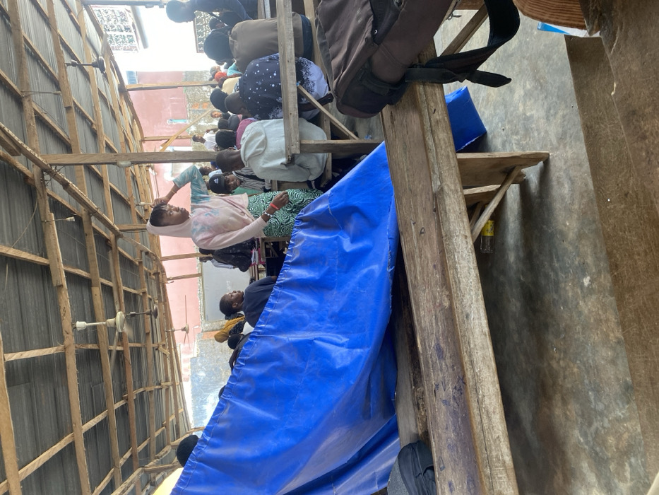 The image depicts an open-air educational or communal gathering space within Ibadan, Nigeria. The structure features a corrugated metal roof supported by exposed wooden beams and posts, from which several white ceiling fans are suspended. The floor is a worn, light-colored concrete surface. In the midground, approximately 15-20 individuals, primarily young adults, are seated at worn wooden benches and tables, facing a general direction where a white board is partially visible. Most individuals are casually dressed, with one person in the background wearing a yellow head covering. Centrally positioned in the midground, a person stands upright, wearing a light-colored tie-dye hooded sweatshirt (pink, blue, white hues) and green patterned trousers. This individual's right hand is raised to their head, appearing to adjust hair or indicate contemplation, and they are looking towards the right side of the frame. In the foreground, a vibrant blue tarpaulin is draped over a wooden bench, partially obscuring the view of the seated individuals behind it. On a wooden bench to the far right in the foreground, a dark-colored backpack rests. A yellow plastic bottle is visible on the floor beneath one of the wooden benches. The background reveals a reddish-brown building exterior outside the open structure.