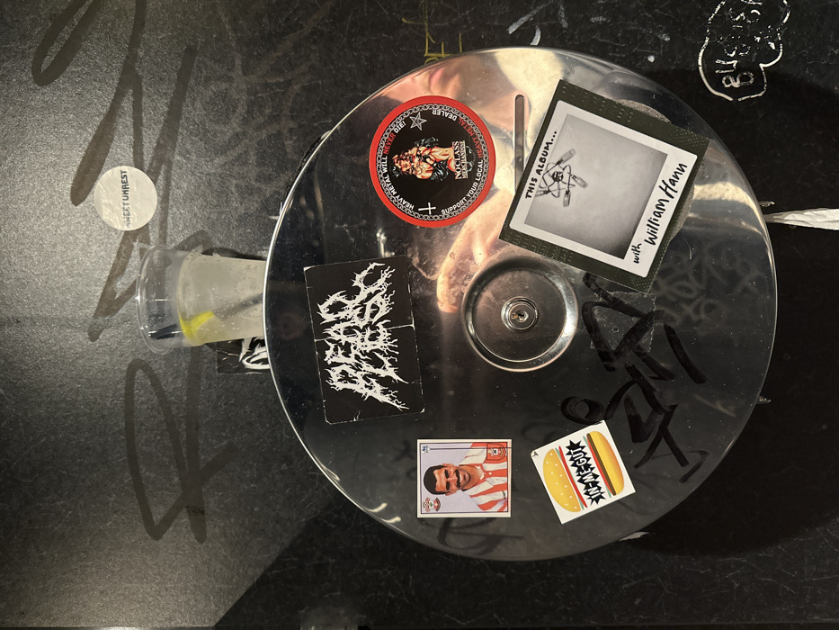 A circular metal surface is covered in an assortment of stickers and graffiti. Stickers include a metal band logo, a red circle with a man flexing, a Polaroid-style sticker promoting an album with William Hann, a soccer player card, and a hamburger. Graffiti in black ink is scrawled across the metal. A plastic cup with liquid and a lemon wedge sits adjacent to the metal surface, along with a small round sticker labeled "SWEET UNREST." The overall scene suggests a cluttered, artistic, or perhaps even rebellious environment.