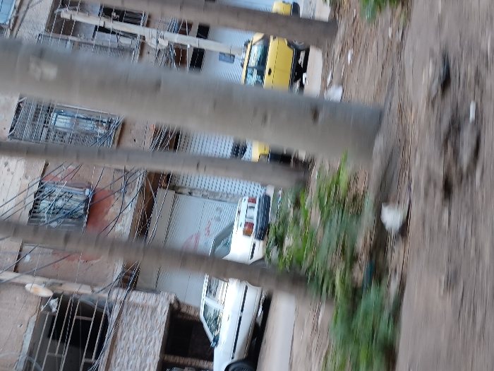 The image displays a daytime street scene in Zamalka, Syria, characterized by significant motion blur and a slight upward diagonal tilt. The foreground consists of an unpaved, brownish-grey ground area, sparsely covered with small green vegetation and scattered small pieces of white debris. In the midground, a paved road is visible, bordered by a line of thick, light-colored tree trunks running vertically through the frame. Two four-door sedans are parked along the street, both facing towards the right. On the left side, a white sedan is positioned closer to the viewer. Further down the street on the right, a yellow sedan is parked. The background is dominated by multi-story buildings, likely residential or commercial, lining the street. The buildings exhibit varying states of repair, with some facades appearing weathered or damaged, including exposed concrete or brickwork. Multiple windows are fitted with metal security bars or grates, some of which appear bent or broken. Several ground-level entrances are covered by closed, corrugated metal roll-down shutters. A dense network of overhead electrical or communication wires is strung between the buildings and utility poles, one of which is partially visible on the far right. A small, light-colored satellite dish is affixed to an upper section of a building on the left. No individuals are present or discernible within the captured scene.