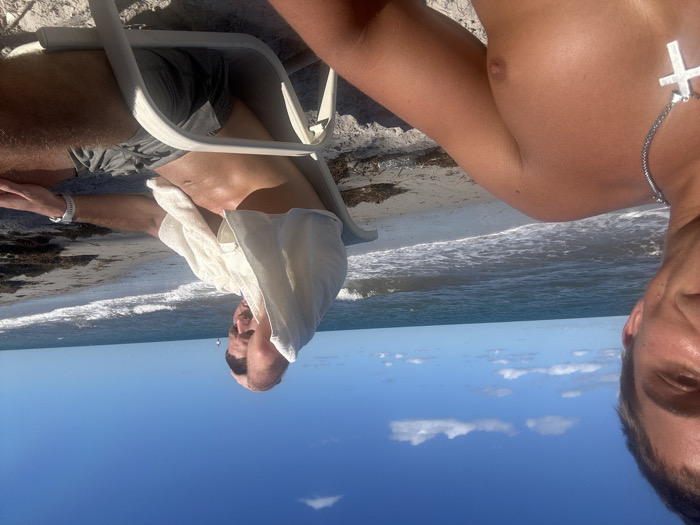 The image displays a beach scene in Key Biscayne, United States, under a clear blue sky with scattered white cumulus clouds. In the foreground, positioned to the left, a male subject is partially visible from the nose upward, along with his right shoulder and upper chest. He has short brown hair, tanned skin, and a slight smile directed towards the camera. He is shirtless and wears a silver chain necklace with a distinct silver cross pendant. To the right and slightly behind, a second male subject is seated in a light-colored beach chair, positioned in profile relative to the camera. He is shirtless, exposing his torso, and wears dark-colored shorts. A light-colored towel is draped over his head and shoulders, obscuring part of his face. His right arm is extended, and a white wristwatch is visible on his left wrist. The male appears to be relaxing, possibly shielding himself from the sun. The immediate environment consists of light-colored sand, with patches of dark seaweed or natural debris visible near the waterline. The ocean extends across the background with small waves breaking on the shore. A faint white object, consistent with a distant boat or buoy, is discernible on the horizon. The scene is illuminated by bright sunlight, casting distinct shadows.