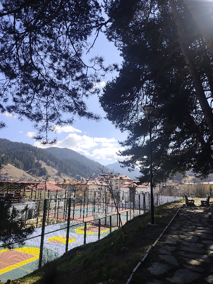 The image displays an outdoor scene in Chepelare, Bulgaria