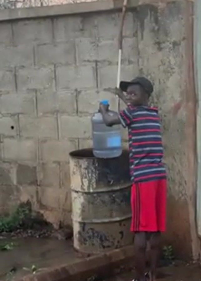 A boy is filling a large water jug at a water source in front of a cinder block wall. The boy wears a striped shirt, red shorts, a black cap and sandals. He leans against a long pole while filling the jug, which sits on top of a rusty barrel. The wall is topped with barbed wire. There is some greenery near the base of the wall, and the ground is wet. The sky is visible in the background.
