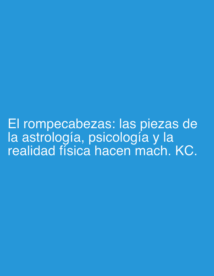 The image contains white text on a solid blue background. The text, in Spanish, reads "El rompecabezas: las piezas de la astrología, psicología y la realidad física hacen mach. KC." which translates to "The puzzle: the pieces of astrology, psychology, and physical reality make mach. KC." The text suggests a metaphorical connection or relationship between these different disciplines or concepts.