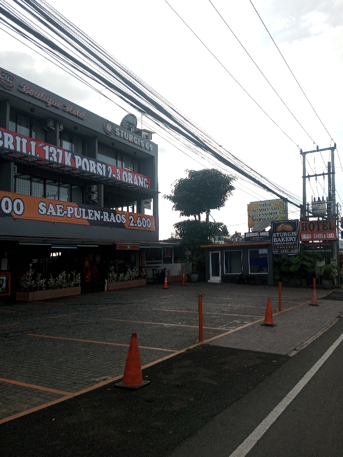 exterior of "Sturgis 69" Boutique Hotel, which includes a grill and bakery. A large banner advertises "137K PORSI 2-3 ORANG" and "SAE-PULEN-RAOS 2.600". Next door is "Sturgis Bakery" and "HOTEL SHABU - SHABU & GRILL". The parking lot is paved with light-colored blocks and marked with orange cones and posts. Overhead, a tangle of power lines crisscrosses the sky.