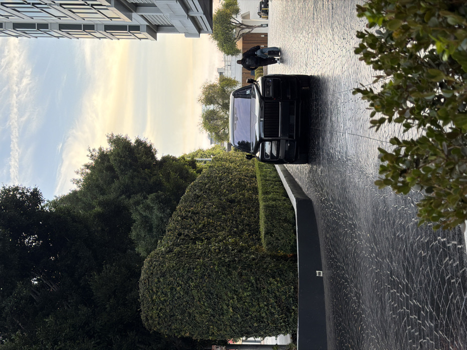 A black Rolls-Royce stands on a patterned, dark driveway next to a well-maintained hedge. A person in dark attire is near a scooter farther up the driveway. Lush trees fill the left side, contrasting with the contemporary building visible at the top. A cloudy sky with sunlight peeks through the building’s upper section. Bushes are prominent on the right side of the frame.