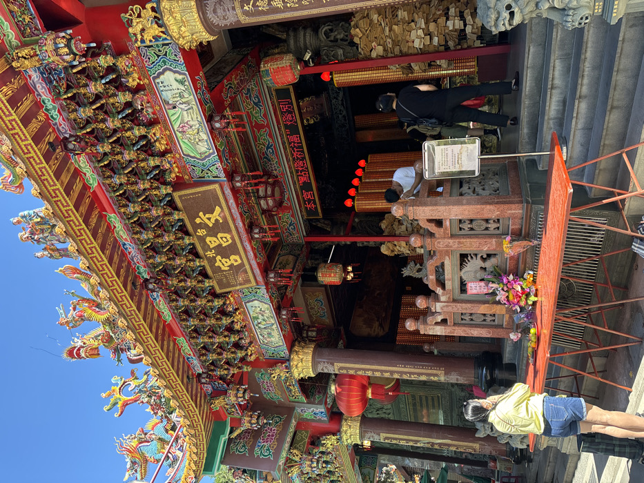 The image captures the ornate facade of a traditional Taiwanese temple, rich in intricate carvings and vibrant colors