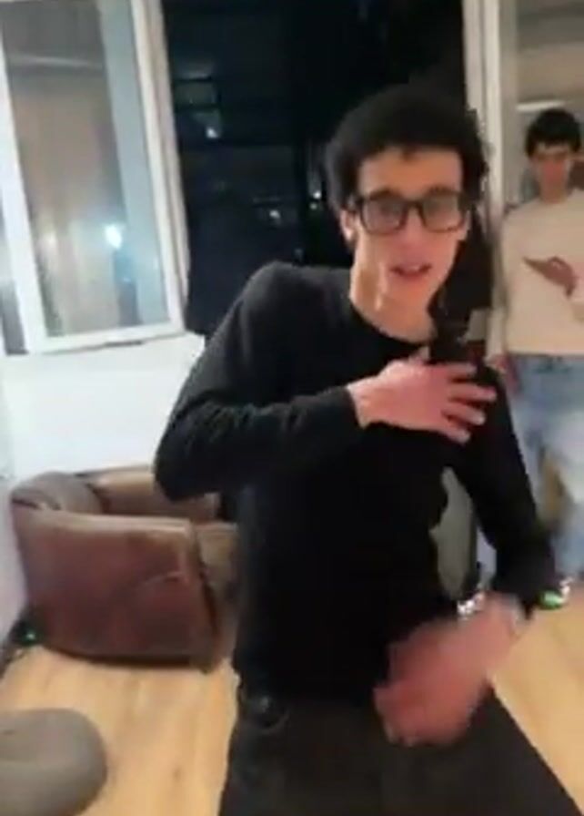 A young man with dark curly hair and glasses dances in a room with a wooden floor. He wears a long-sleeved black shirt and dark pants. He moves his arms and torso, seemingly to the music. Behind him, there are other people in the room, including one wearing a light-colored shirt and blue jeans, and another in a BMW jacket and a pink baseball cap, holding a cylindrical object. There's a brown leather armchair in the background near a glass door.