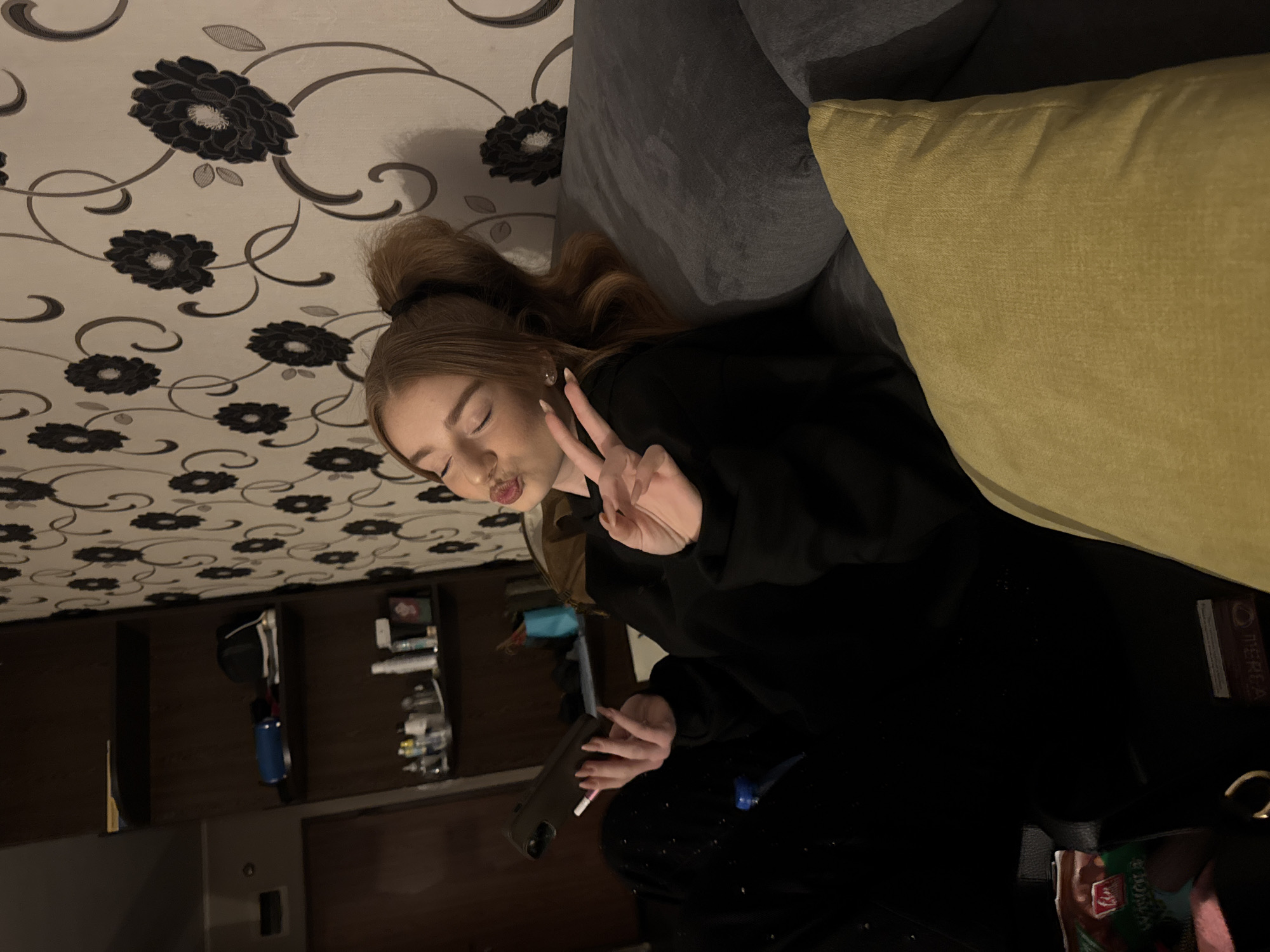 A young woman with auburn hair pulled into a high bun is lying on a grey couch with a yellow pillow. She puckers her lips in a kiss and raises two fingers in a peace sign. She is wearing a black hoodie and black pants. Her phone is in her hand and she seems to be holding a lit cigarette. Above her is a white patterned wall, with a dark brown shelf with various objects on it.