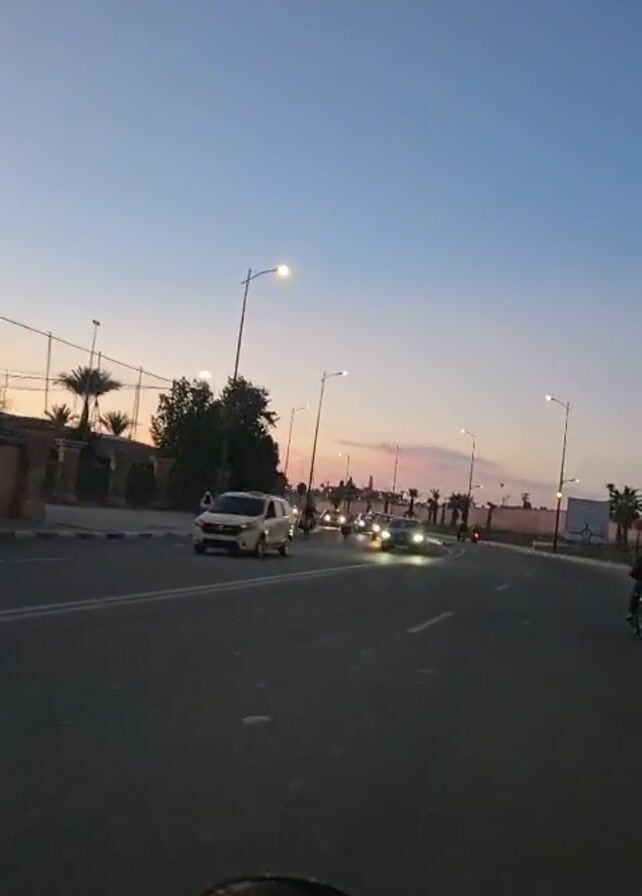 The video captures a twilight street scene from the perspective of a moving vehicle, possibly a motorcycle, indicated by the partial view of a round mirror at the bottom. The road is wet, suggesting recent rain. Several cars with headlights on are visible driving on the road. Along the side of the road are streetlights, trees including palm trees, and a wall or fence. The sky is a gradient of colors, from deep blue to pale pink and orange, indicating dusk. Some figures can be seen walking on the sidewalk.