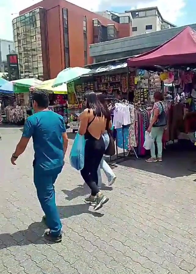 n outdoor market with stalls selling various goods, including clothing, fruits, and small accessories. People are walking around, browsing the merchandise. The market appears to be set up on a paved area, possibly a pedestrian zone in a city. Buildings are visible in the background. The weather seems sunny and partly cloudy.
