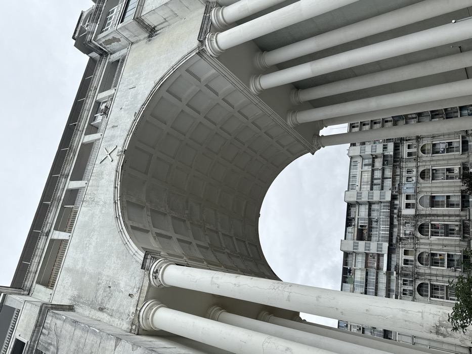 A large, weathered, light-gray Stalinist Neoclassical residential building dominates the foreground, featuring a prominent arched passageway. This structure is located on Rustaveli Avenue in Batumi, Georgia. Multiple slender classical columns, exhibiting visible cracks and surface degradation, support the arch, which has a coffered ceiling composed of square panels. The facade above the arch exhibits extensive weathering, paint discoloration, and a discernible 'X' emblem centered above the arch's apex. Upper stories include balconies with metal railings; a white, bird-like object is visible on a balcony to the upper right. Through the central arch, a multi-story, utilitarian Soviet-era apartment block is visible, characterized by numerous windows and diverse balcony enclosures. The scene is illuminated by an overcast sky. No individuals or active interactions are observed.