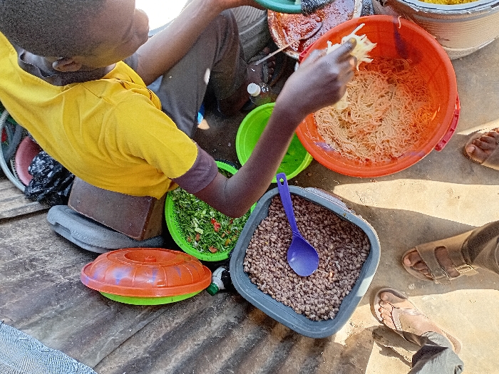 The image depicts an outdoor food preparation or serving scene in Rijiyar Zaki, Nigeria