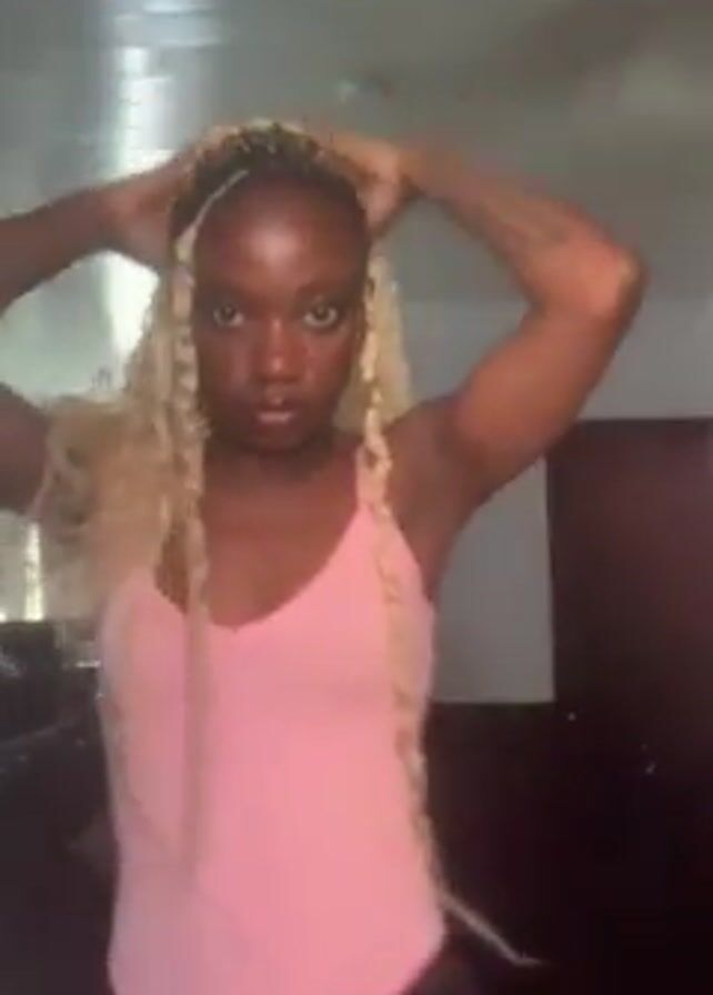 A woman is centered in the frame from the waist up. She has dark skin and is wearing a pink tank top and black shorts. Her hair is styled in a long, blonde ponytail of curly or braided hair. The room she is in has a shiny ceiling, and a window can be seen in the background. She tosses her hair, moving it from behind her head to in front, then back again. She looks directly at the camera.