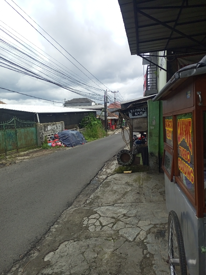 A narrow asphalt road runs through a village under a cloudy sky. The road is bordered by buildings and fences. On the left, a green fence fronts a white-walled structure with covered debris. On the right, a sidewalk with cracked concrete leads to a small business with a green sign labeled "TAMBAL BAN" and a food cart advertising "CAKWE TURBO GOWANG." Overhead, numerous electrical wires crisscross the sky.