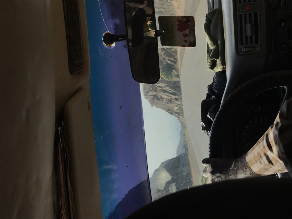 An interior view from a vehicle with a steering wheel and driver's arm visible. Outside, a landscape of tan hills and a hazy sky are seen through the cracked windshield. A rearview mirror is mounted on the windshield. The vehicle's dashboard includes air vents. A Guess card is dangling from the rearview mirror. Some clothing is placed atop the dashboard.