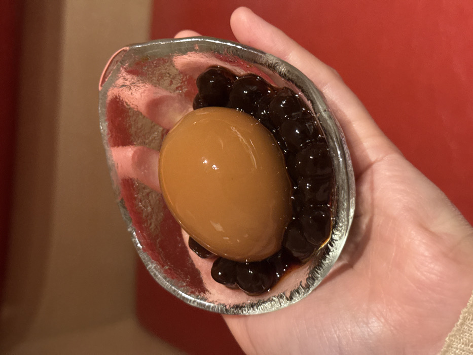 A light-skinned hand, with partially visible fingers and thumb, holds a small, clear, irregularly shaped glass dish. The dish contains a single, prominent, smooth, amber-colored ovoid object resting atop a cluster of numerous small, dark brown to black spherical objects, which appear to be suspended in a dark, viscous liquid. The amber object exhibits a glossy surface reflecting ambient light. The hand is positioned against a solid, out-of-focus, vibrant red background. The individual's attire includes a light-colored fabric, possibly a sleeve cuff, visible at the lower left edge of the image. The specific location within the city of Thủ Đức, Vietnam, cannot be determined from the visual information provided.