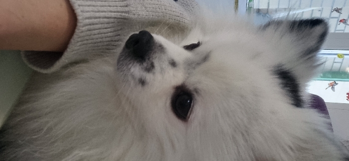 - "A fluffy white dog with black spots on its nose and gray ears is tilted upside down" by FM-dVuyr2, licensed under CC BY 4.0