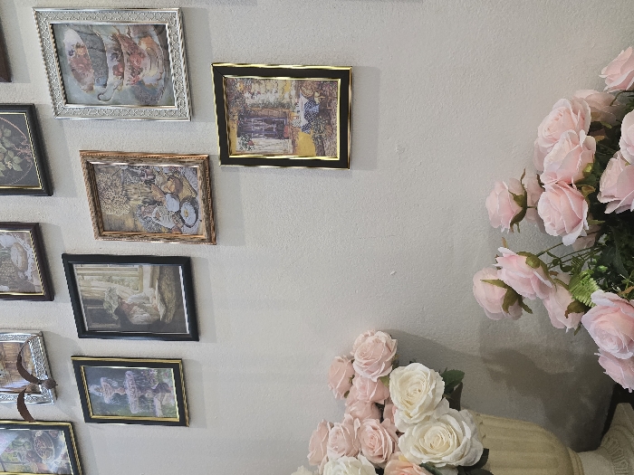 The scene is an interior view within Chiang Mai City Municipality, Thailand. A plain, light-colored wall features a gallery display of nine framed artworks. Frame styles include black with gold inner edges, ornate silver, and dark brown with gold accents. Specific images depicted are: a fountain, a woman in a hat reading by a window, a still life with food items (bread, fruit) in an outdoor setting, a stack of three floral-patterned teacups, and various floral or landscape motifs. In the foreground, two arrangements of artificial roses are visible. To the lower left, a cream-colored urn contains white and light pink roses. To the lower right, a separate cluster of light pink roses with green foliage occupies the bottom of the frame. No living individuals are present, and no active events are occurring.
