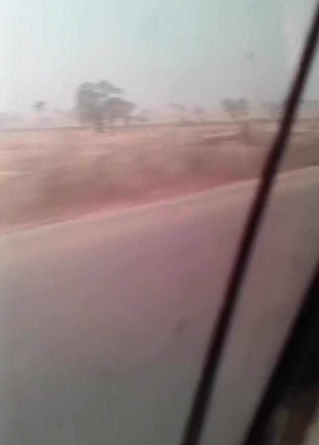 view from a moving vehicle looking out the side window at a rural landscape. The landscape is flat and dry, with sparse vegetation and a few scattered trees visible in the distance. The sky is hazy, and the overall visibility is low. The road adjacent to the landscape is gray and appears to be paved. The vehicle's window frame is visible on the right side of the frame, slightly obscuring the view.
