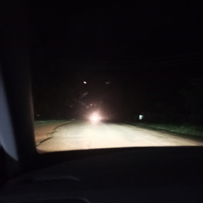 The image captures a nighttime view from inside a vehicle, focusing on a dimly lit road ahead. The road is illuminated by the headlights of an oncoming vehicle, which creates a bright, blurry spot in the center. Dark, undefined trees and vegetation line both sides of the road. The vehicle's dashboard and parts of the interior are visible at the bottom of the frame, adding to the first-person perspective. The overall scene is dark and somewhat grainy.