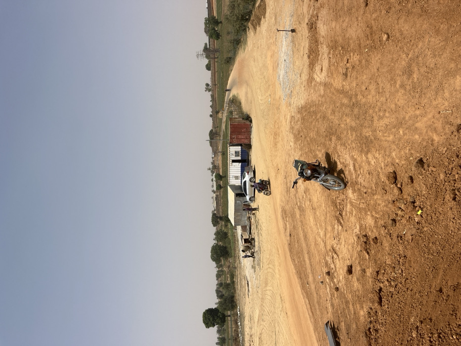 This image depicts a dry, rural or semi-urban landscape in Gyellesu, Nigeria, under a hazy, light blue sky. The foreground consists of reddish-brown dirt and scattered debris, with a silver motorcycle parked facing slightly left. In the midground, a dirt road curves from the left towards the right, leading into the distance. To the left of the road, a small group of approximately three individuals stands near a cement mixer, actively engaged in a task. A light-colored sedan is parked nearby, next to a corrugated metal structure and two modified shipping containers, one blue and white, and another red. A person rides a dark motorcycle away from the viewer on the dirt road. Further along the road to the right, a shovel is stuck upright in the ground. The background reveals sparse green vegetation, scattered distant structures, and utility poles under a wide, open sky.