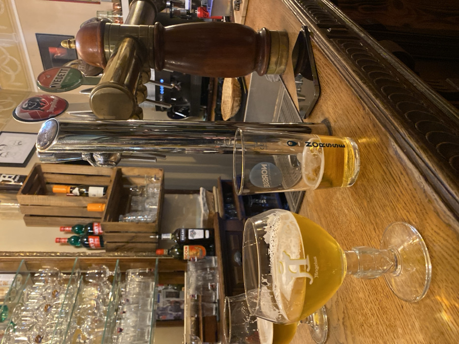 A beer tap with a wooden handle stands on a wooden bar alongside glasses of beer. Some are filled to varying degrees. In the background, a shelf holds bottles of wine and liquor, along with stacked glasses. A wooden crate containing bottles sits atop the shelf. Brewery logos can be seen on the beer tap levers and beer glasses.