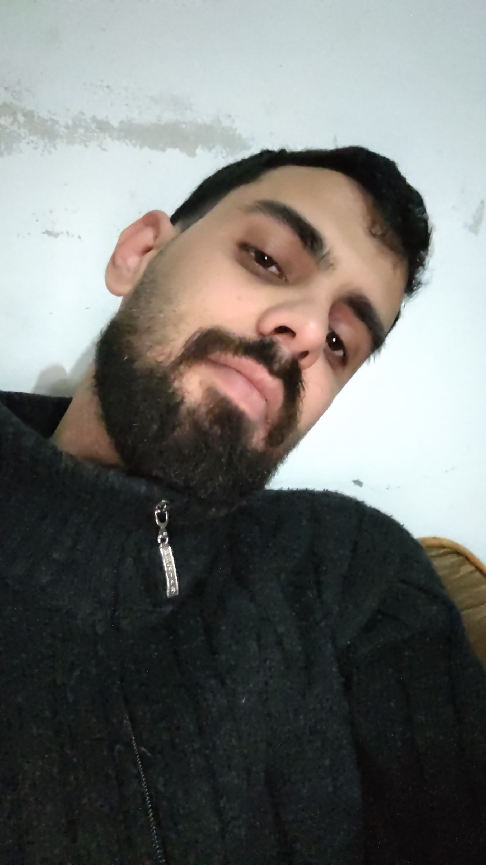 A bearded man with dark hair and eyebrows is captured in a close-up selfie. He's wearing a dark, textured zip-up sweater. The background is a plain white wall with some smudges or imperfections. The lighting is relatively soft, highlighting his facial features. He gazes directly at the camera with a slight downward tilt of his head.