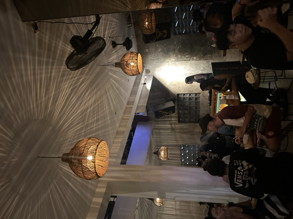 An indoor space shows a group of people gathered near a bar. A mix of overhead lighting includes woven pendant lamps and ceiling fans that cast patterned light on the walls. The decor is a mix of modern and industrial elements. Some patrons appear to be smoking. The overall atmosphere seems relaxed and social.